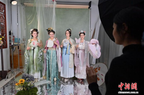 11月9日,在吉林長(zhǎng)春的一家漢服體驗(yàn)館,德國(guó)友人身著精美漢服拍攝寫真。近年來(lái),漢服日益受到外籍人士青睞。該館已為超百名外籍人士提供漢服體驗(yàn)和拍攝服務(wù),讓他們?cè)诔两脚臄z中,了解中國(guó)傳統(tǒng)文化。中新社記者 張瑤 攝